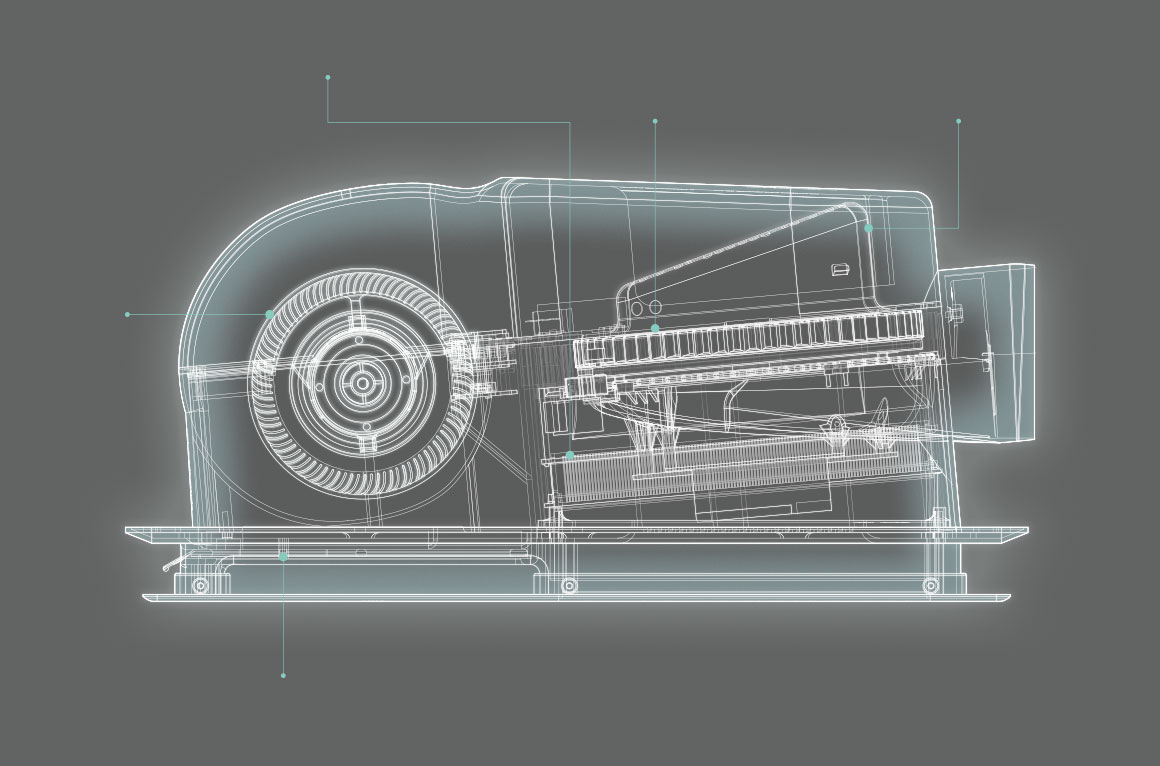 吊隱式設計無須受制於一般立式除濕機型追求「小而美」的輕體限制,以除濕效能為第一優先考量,摒除將除濕輪與熱交換器前後交疊配置的設計,創新採用平行並列方式,一來有助於濕冷空氣在進入導風板後,可平均帶入除濕輪和熱交換器,以達雙軌並行除濕,有效縮短除濕時間;二來可減少風阻,加速空氣對流量,進而提升除濕效率。